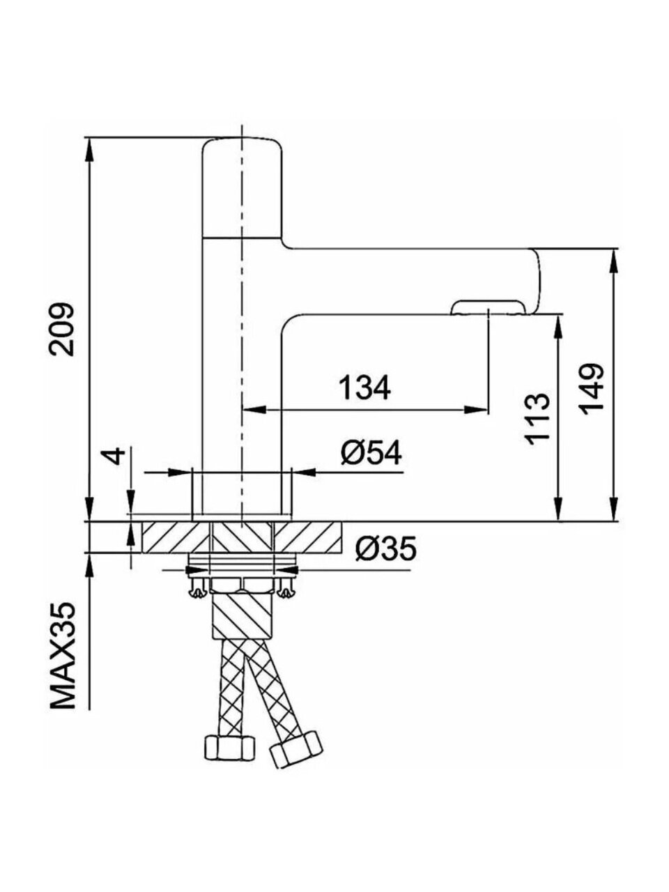 Высота излива — 11,3 см, длина — 13,4 см; монтажное отверстие — 35 мм, что подходит для большинства стандартных раковин.