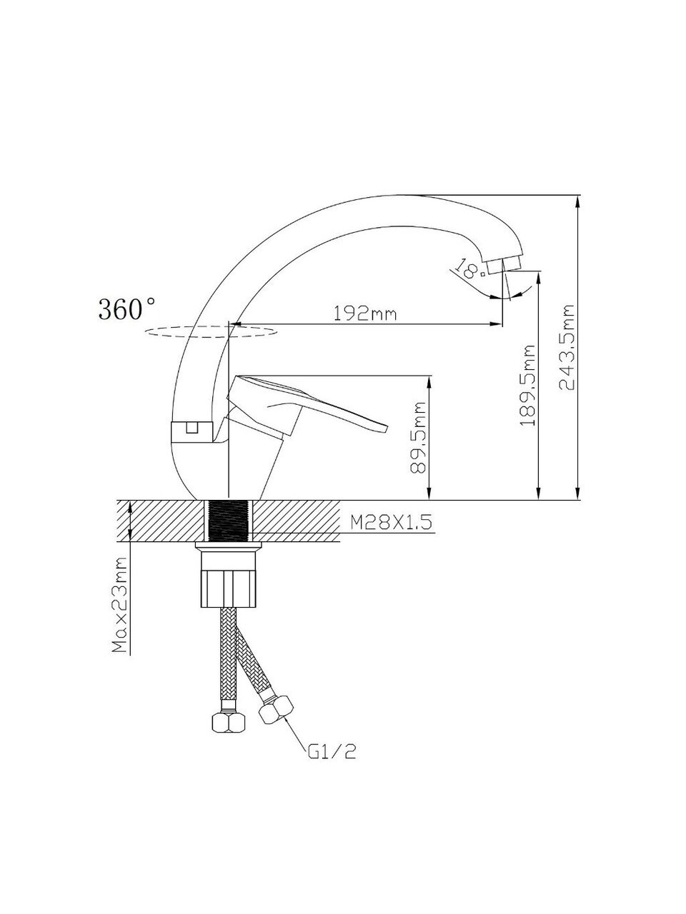 Длина излива — 19,2 см, высота — 18,9 см; смеситель рассчитан на монтаж в одно отверстие диаметром 35 мм.