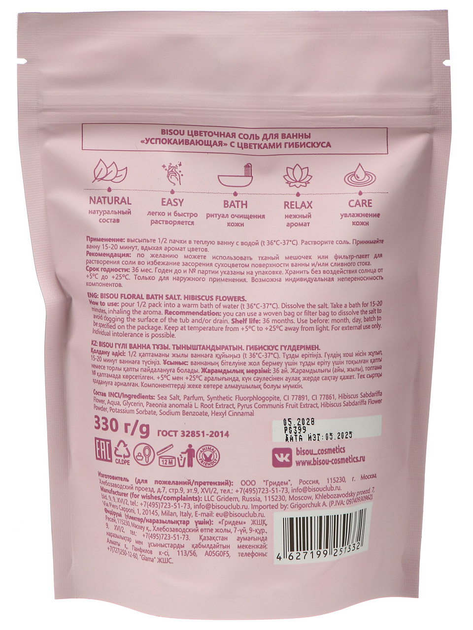 - Эксклюзивная формула: натуральная морская соль с экстрактом гибискуса и эфирными маслами для глубокого расслабления.