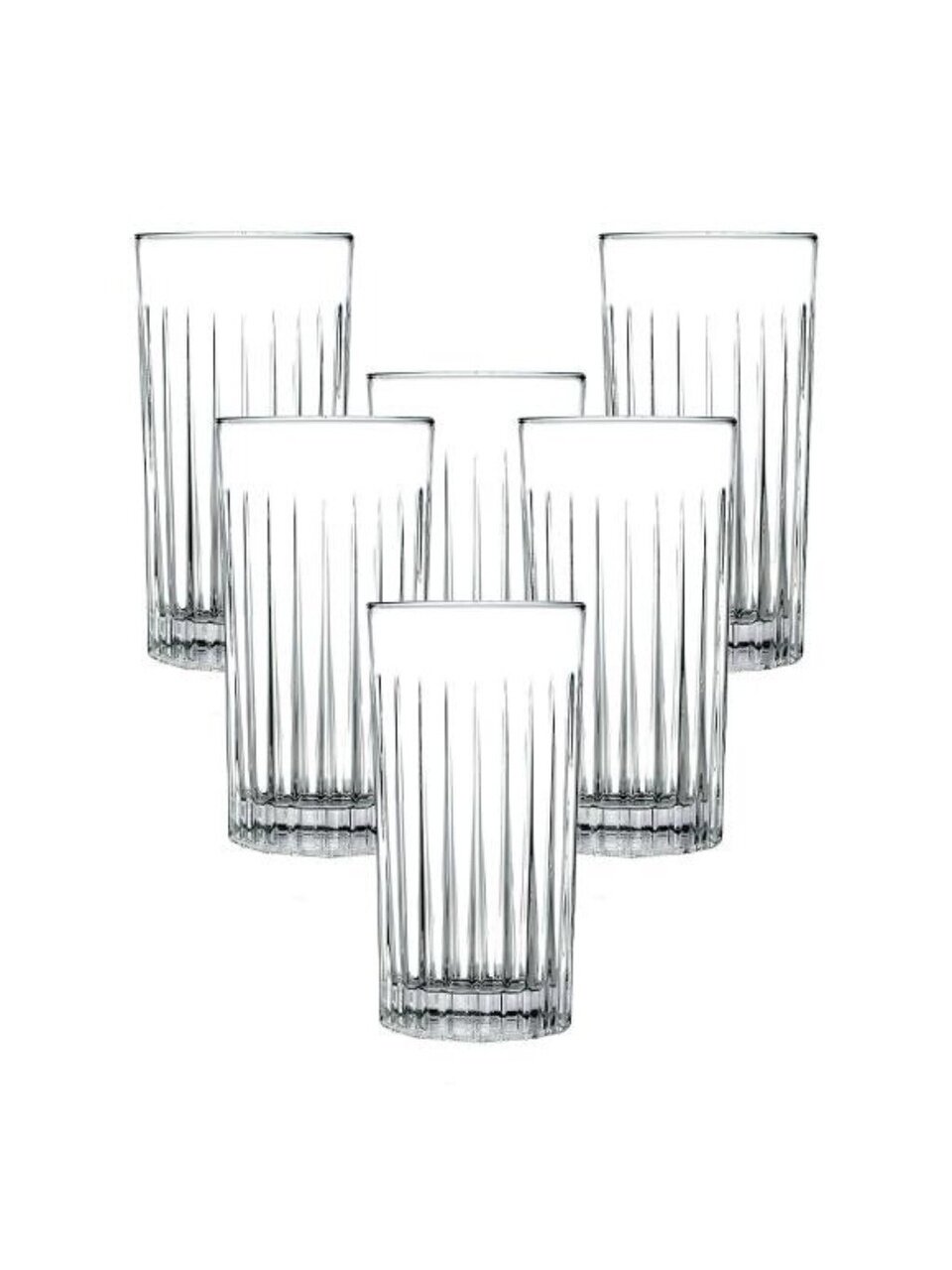 В наборе 6 стаканов, каждый объёмом 440 мл, форма хайбол — высокие и широкие, что удобно для ежедневного и праздничного использования.