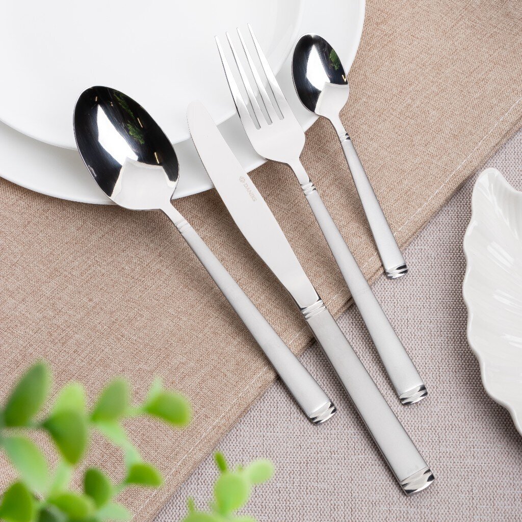 В комплект входит 24 предмета — это оптимально для сервировки стола на 6 персон. Длина каждого прибора — 22,6 см, вес набора — 1,01 кг.