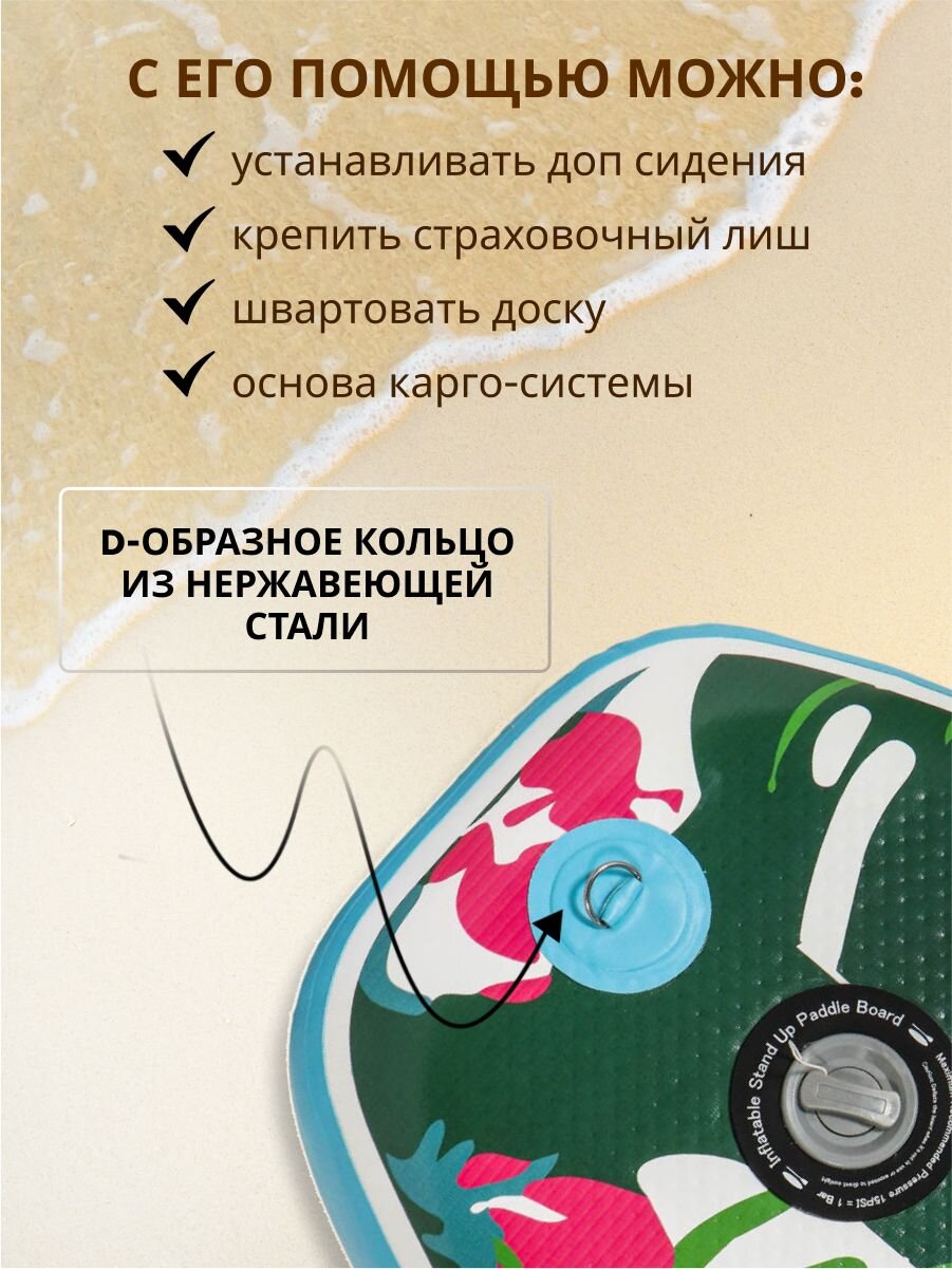 - D-образные кольца из нержавеющей стали (D 3 мм, D 4 мм). Это важный элемент, увеличивающий комфорт использования и функционал САП-борда. Кольца позволяют устанавливать специальные САП сиденья, крепить страховочный лиш, они же являются основой для карго системы, а также кольцо на носовой части позволяет швартовать доску или подвешивать её для высушивания.