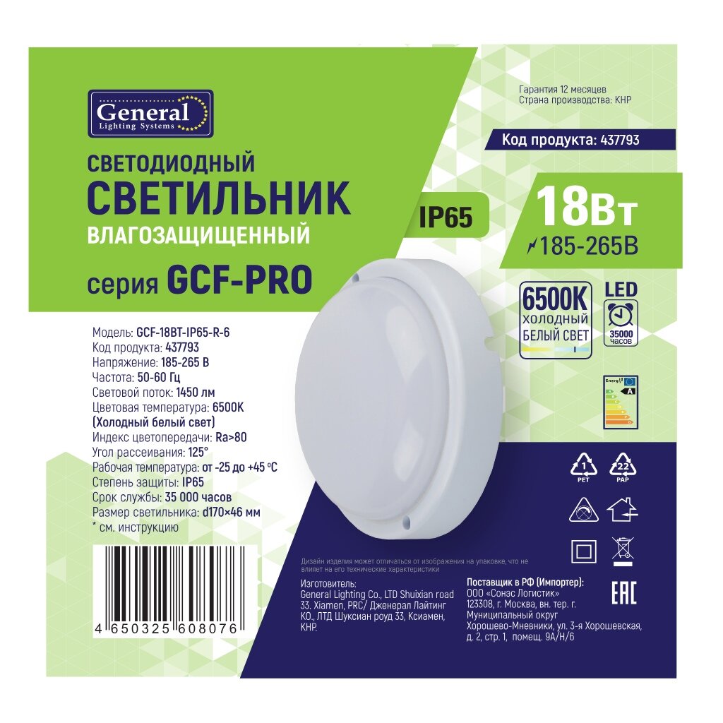 Светодиодный светильник ЖКХ GE 18 Вт IP65 — экономичное решение для освещения подъездов, производственных помещений и дачи. Яркий холодный свет 6500К, влагозащита IP65, срок службы 35 000 часов.