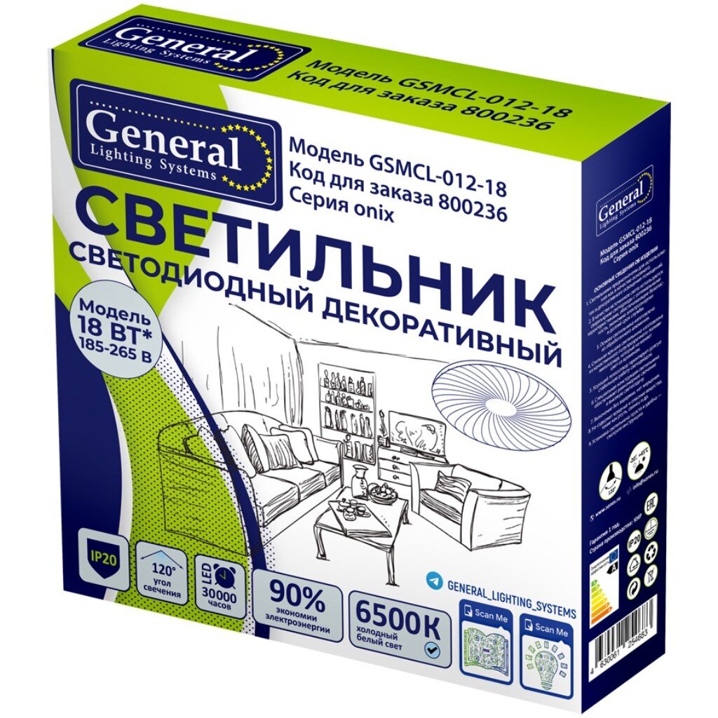 Светодиодный потолочный светильник General 18 Вт: экономия энергии, холодный белый свет 6500К, срок службы 30 000 ч. Идеальное решение для современного интерьера.