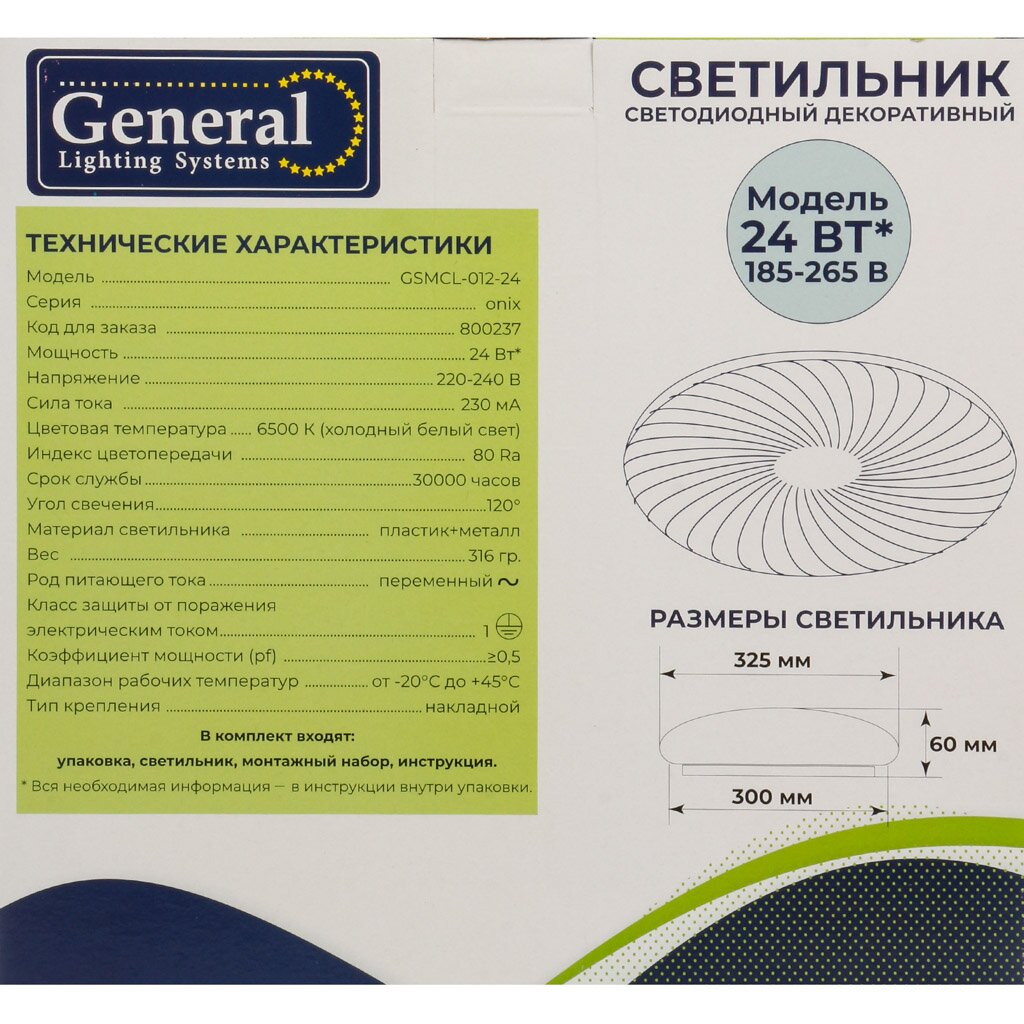 Модель General GSMCL-012-24 Onix с холодным белым светом (6500 К) и мощностью 24 Вт обеспечивает отличную яркость и равномерное освещение, идеально подходит для кухни, прихожей и рабочих зон.