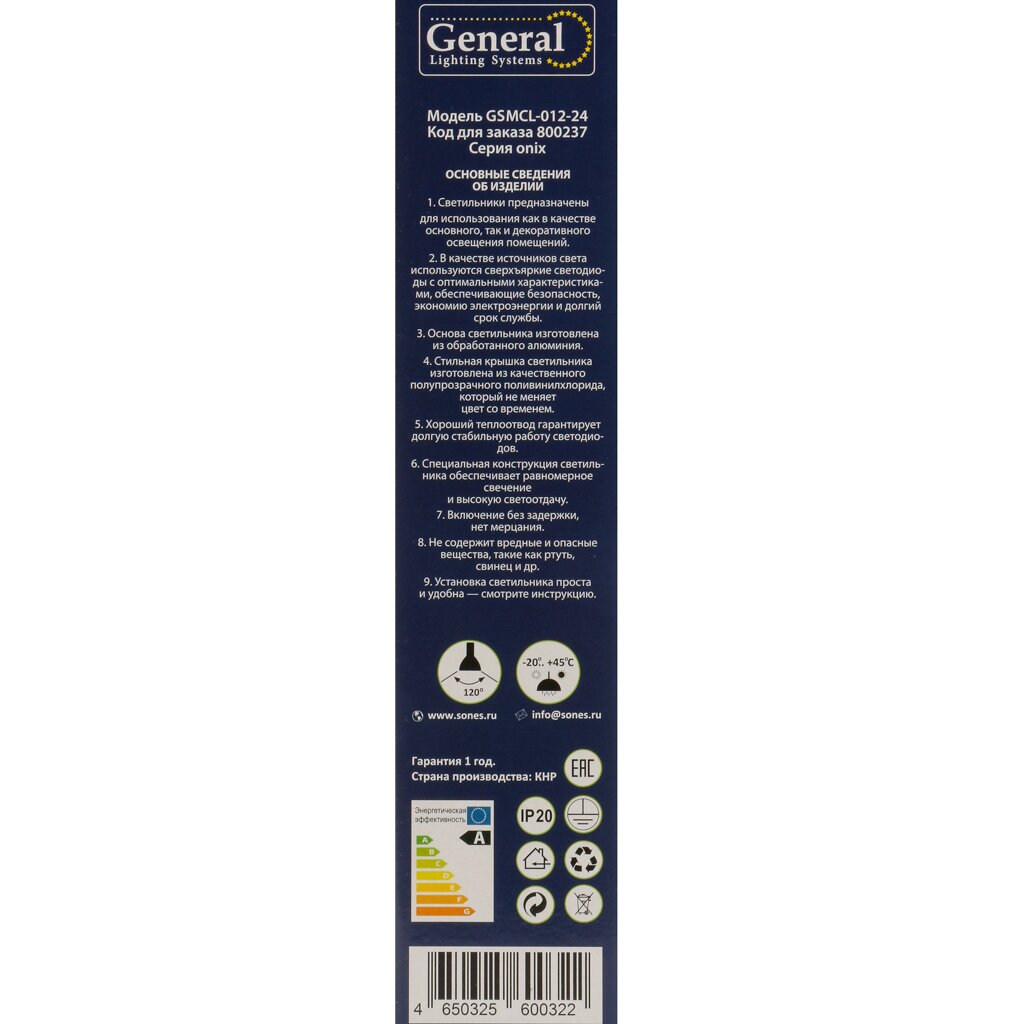 В отличие от классических ламп накаливания, светодиодная модель General GSMCL-012-24 Onix не нагревается, не мерцает и служит до 30 000 часов. Корпус и плафон выполнены из прочного пластика, что обеспечивает легкость и безопасность монтажа. Часто покупатели интересуются, подходит ли этот светильник для ванных комнат — степень защиты IP20 делает его оптимальным для сухих помещений, но не рекомендуем использовать во влажных зонах. Для тех, кто ищет недорогой светодиодный светильник для дачи или квартиры, это отличный вариант по соотношению цена/качество.