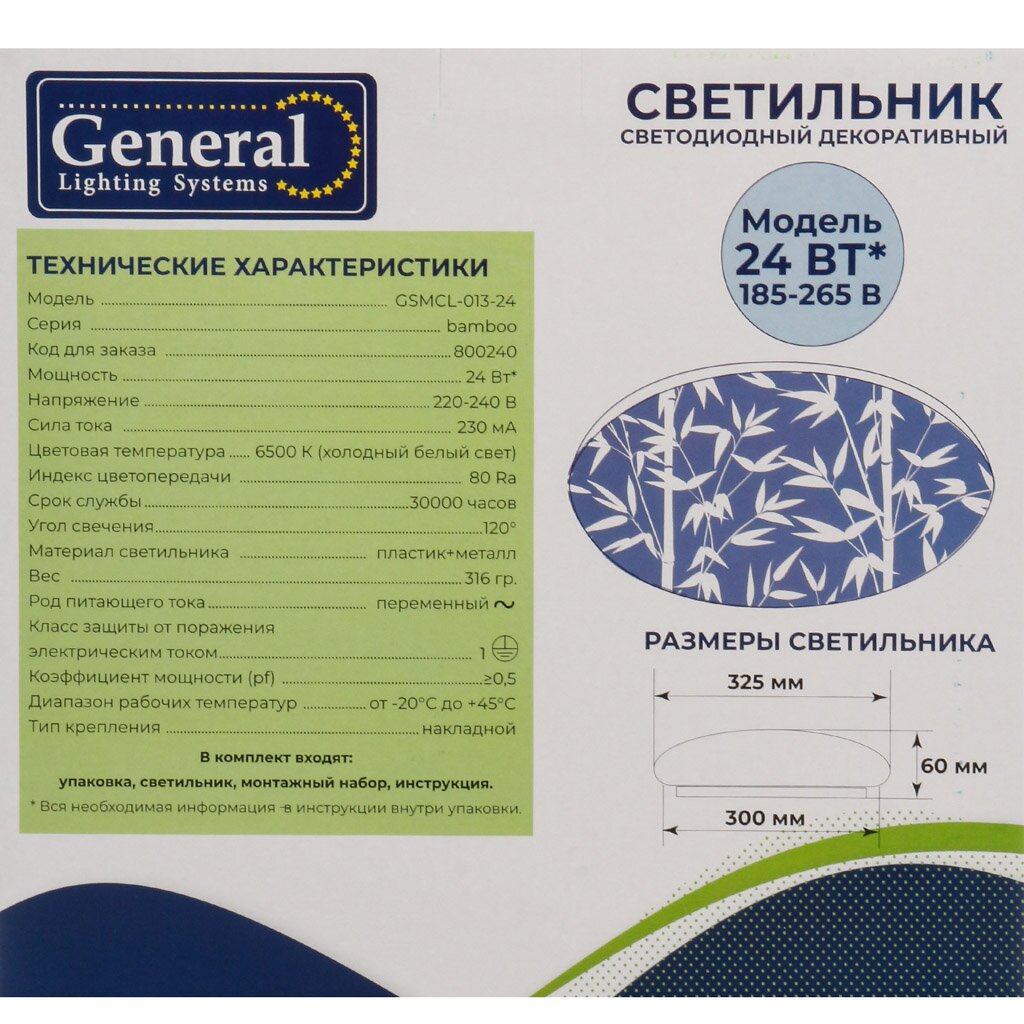 Светильник светодиодный потолочный General 24 Вт — энергоэффективный холодный свет 6500 К для яркого освещения дома и офиса. Прочный пластик, срок службы 30 000 ч.