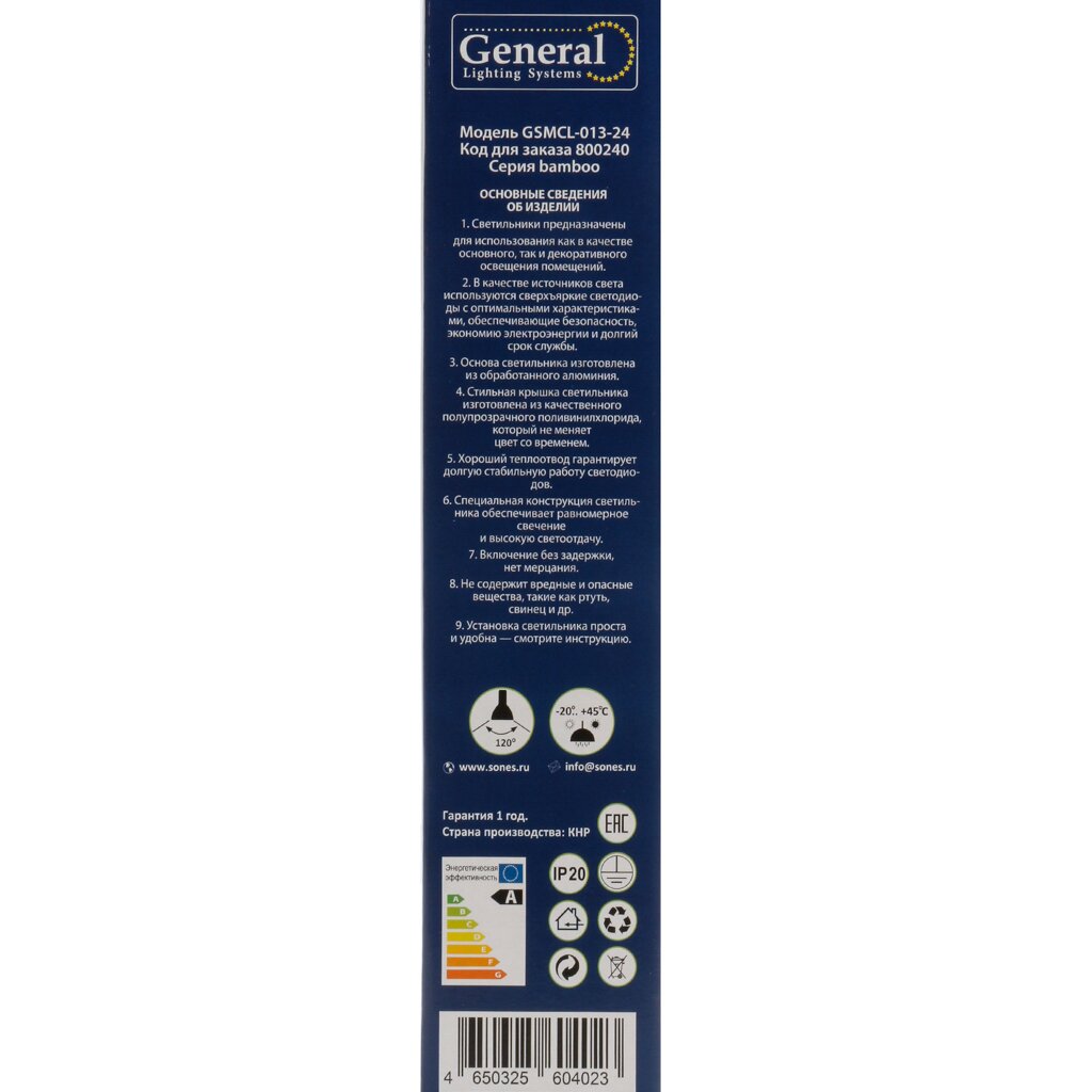 Светильник потолочный светодиодный General GSMCL-013-24 Bamboo — оптимальное решение для тех, кто ищет недорогой, но эффективный LED-светильник для дома или офиса. Мощность 24 Вт и холодный белый свет 6500 К создают яркое освещение, близкое к дневному, что важно для рабочих и учебных зон. Благодаря встроенному светодиоду и надежному пластиковому корпусу, модель не требует замены ламп и рассчитана на 30 000 часов работы. Это выгодно отличает её от классических люстр с лампами накаливания, которые требуют частой замены и потребляют больше энергии.