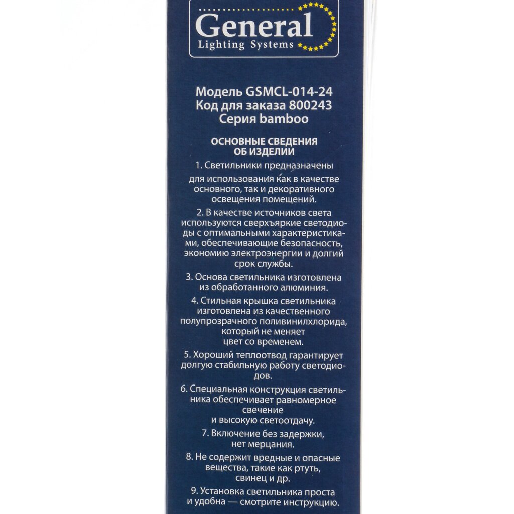 Потолочный светодиодный светильник General GSMCL-014-24 Bamboo — это оптимальный выбор для тех, кто ищет, какой светильник лучше выбрать для дома или офиса. Благодаря нейтральному белому свету (4000 К) прибор обеспечивает комфортное освещение, не искажая цвета и не утомляя глаза. Встроенные светодиоды LED гарантируют стабильный световой поток 1560 лм и низкое энергопотребление — актуально для тех, кто хочет купить недорого светильник для дачи или квартиры и снизить счета за электричество.