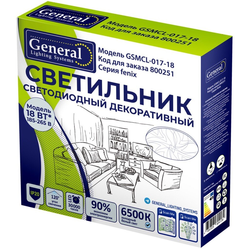 Светодиодный потолочный светильник General 18 Вт — яркое освещение 6500K для квартиры и офиса, энергоэффективность и срок службы до 30 000 часов по доступной цене.