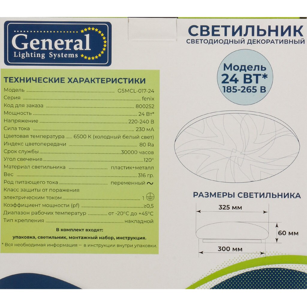 Ищете, какой потолочный светодиодный светильник выбрать для дома или офиса? General GSMCL-017-24 Fenix — оптимальное решение для тех, кто ценит яркий, равномерный свет и простоту монтажа. Холодный белый свет 6500 К отлично подходит для рабочих зон, кухни, коридора или прихожей, обеспечивая максимальную видимость и комфорт для глаз. Благодаря встроенным светодиодам вы экономите на электроэнергии и забываете о частой замене ламп.