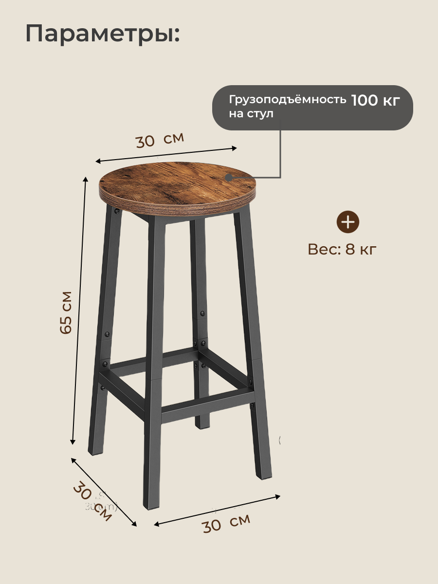 Габариты стула: глубина 300 мм, ширина 300 мм, высота 650 мм. Такая высота оптимальна для стандартных барных стоек и высоких кухонных столов.
