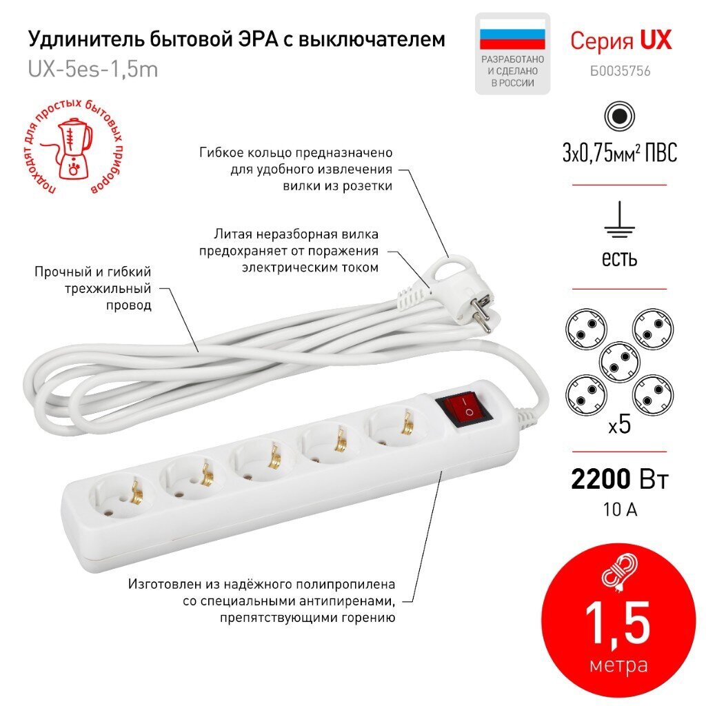 Удлинитель электрический Эра UX-5es-1,5m рассчитан на максимальную мощность 10 А/ 2200 Вт. Удлинитель Эра станет Вашим надежным помощником, если любимые электроприборы находятся далеко от розеток. Провод в удлинителях Эра сделан из 100% меди, что делает его абсолютно пожаробезопасным. Корпус выполнен из ударопрочного и негорючего пластика (полипропилен). Вилка обеспечена кольцом для удобного извлечения ее из розетки. Модель удлинителя на 10 А позволяет подключить бытовые приборы общей нагрузкой до 2200 Вт. Дизайн удлинителя разработан в России командой Эра Style.