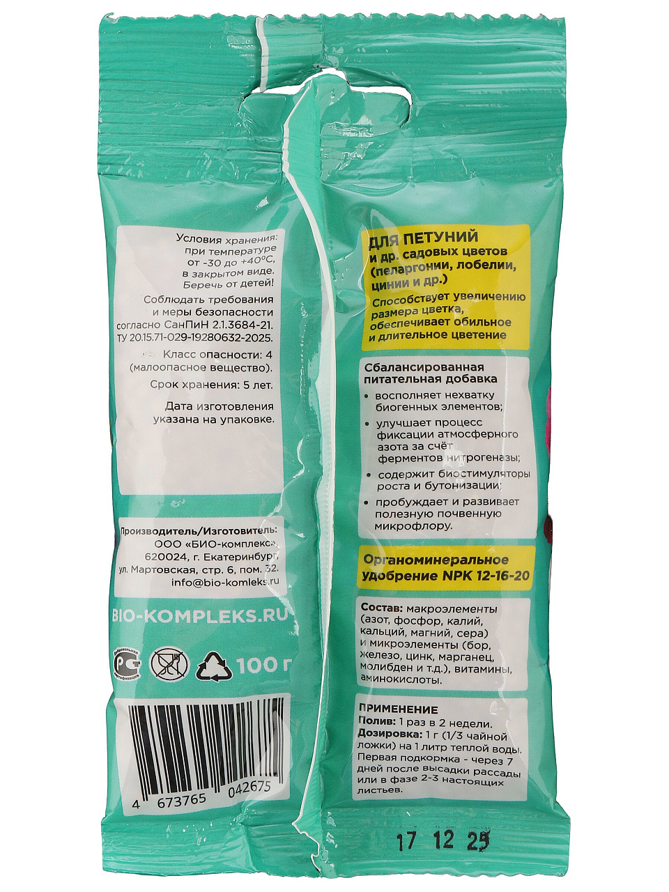Пакет 100 г рассчитан на полный сезон ухода за петуниями или декоративными растениями на площади до 10 м².