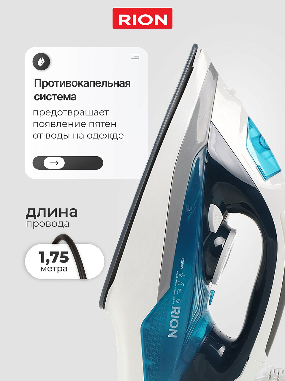 - мощность 2200 Вт: быстрое и эффективное глажение;