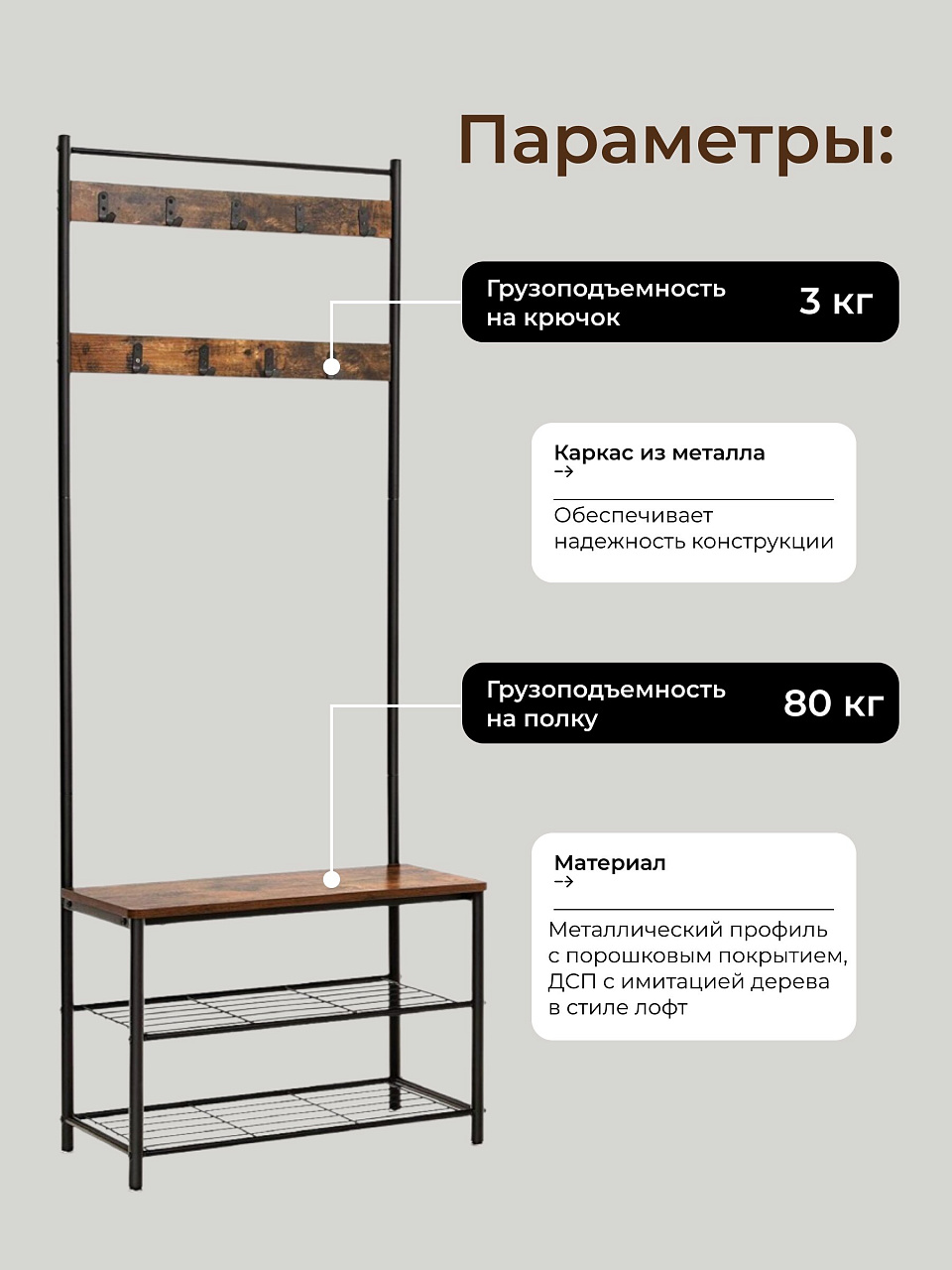 Вешалка рассчитана на максимальную нагрузку до 80 кг, что позволяет размещать зимние куртки, пальто, обувь и аксессуары без риска деформации. Металлическая конструкция устойчива к тяжелым вещам.