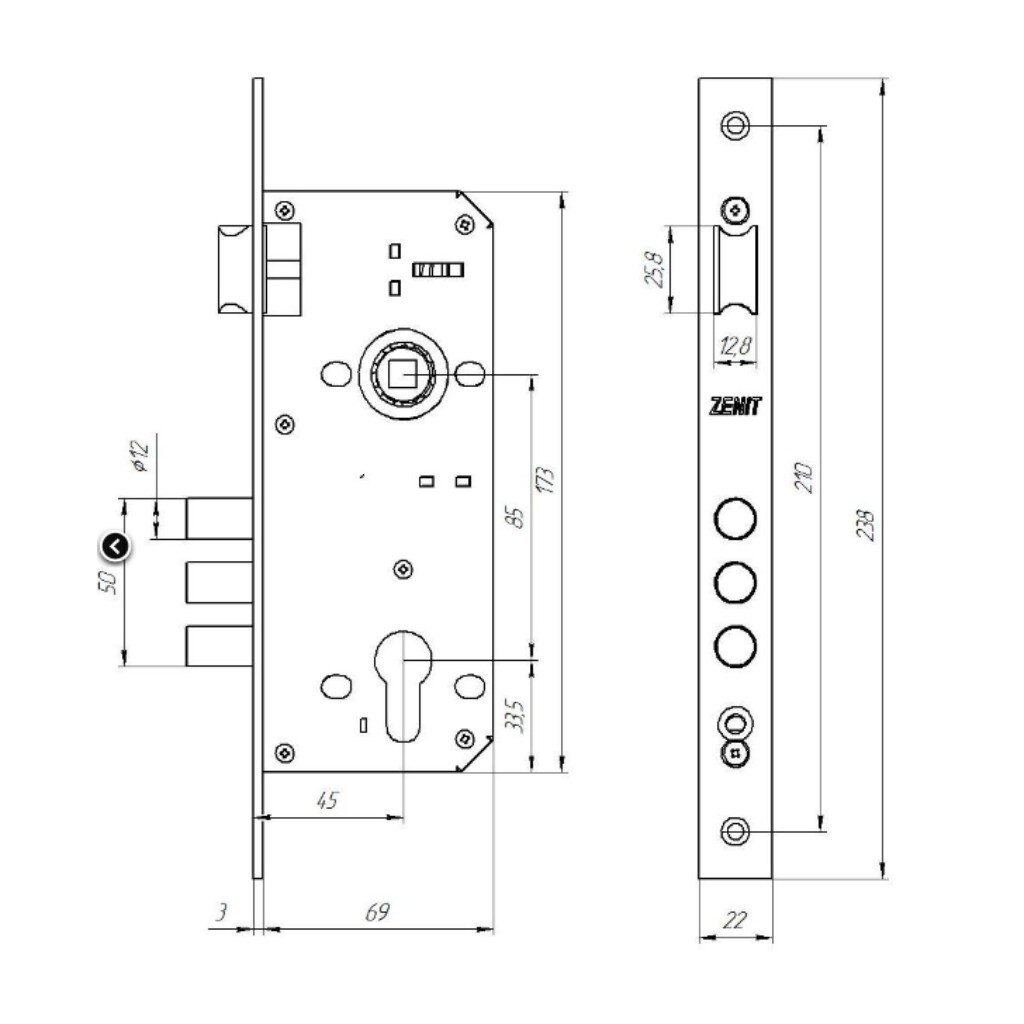 Замок врезной Зенит ЗВ4-85 цилиндрового типа предназначен для запирания левосторонних и правосторонних дверных полотен, открывающихся как внутрь, так и наружу. По посадочным размерам совпадает с замками Апекс 22 серии, Аллюр, Фуаро и другими замками китайского производства с межосевым расстоянием 85 мм. Замок рекомендуется устанавливать на наружные деревянные двери квартир и общественных зданий, толщина которых 40-45 мм, также возможен монтаж на металлические двери. Количество кодовых комбинаций цилиндрого механизма МЦ1-6 составляет 15.000 вариантов ключа. Замок врезной Зенит ЗВ4-85 цилиндрового типа сертифицирован по ГОСТ 5089 - замку присвоен 2 класс. Защелка дверного замка универсальная - смена стороны открывания происходит при вскрытии корпуса. Замок комплектуется фалевыми ручками с накладками типа РФ1-1-85. Дверные ручки крепятся между собой стяжными винтами.