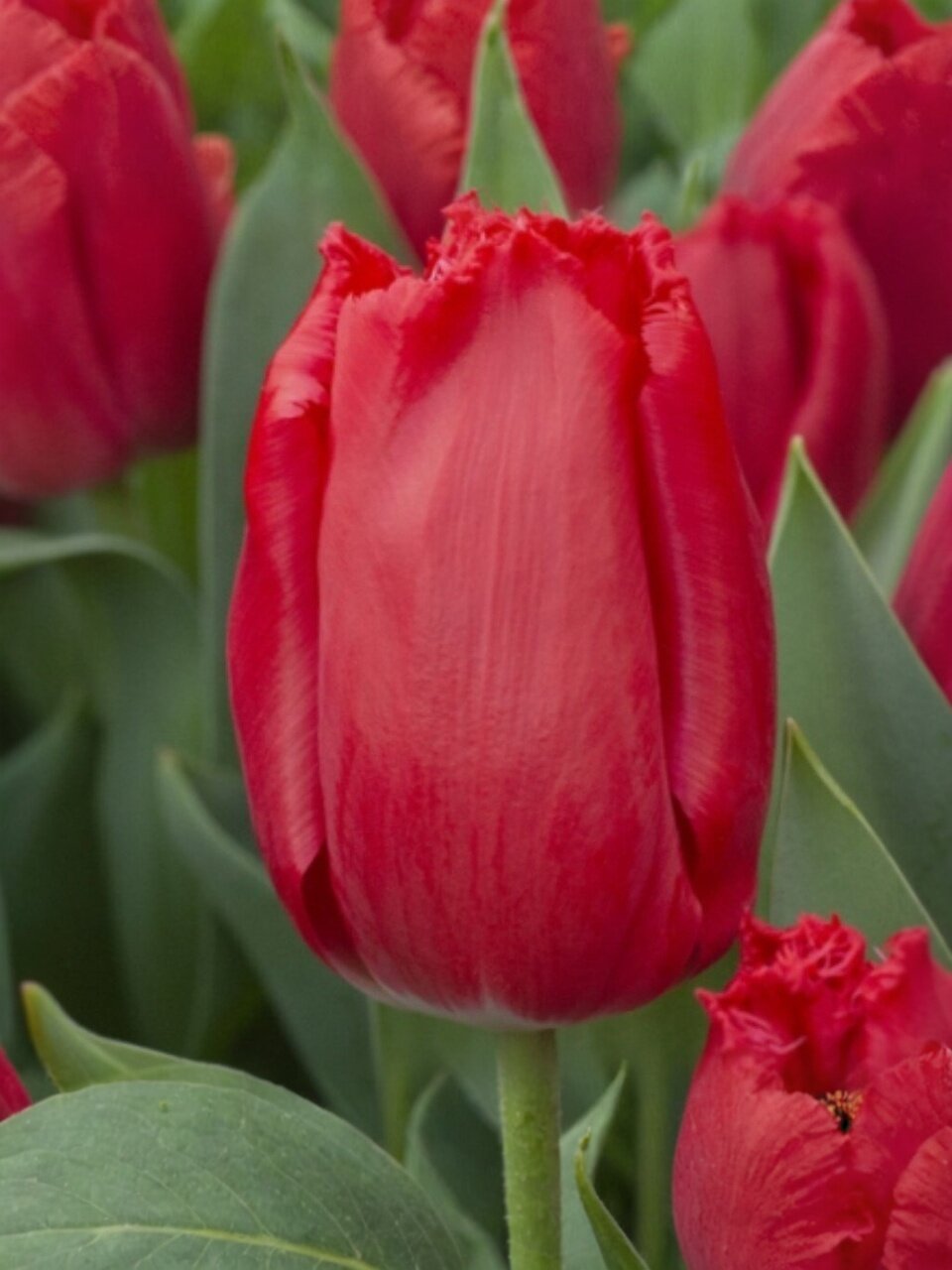 - Ярко-красные бахромчатые тюльпаны — редкая коллекционная окраска для эффектных цветников